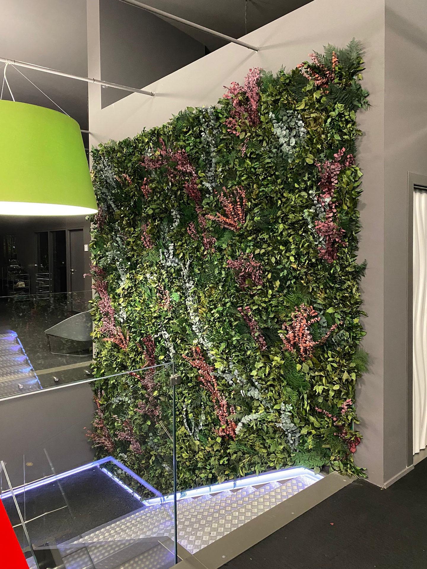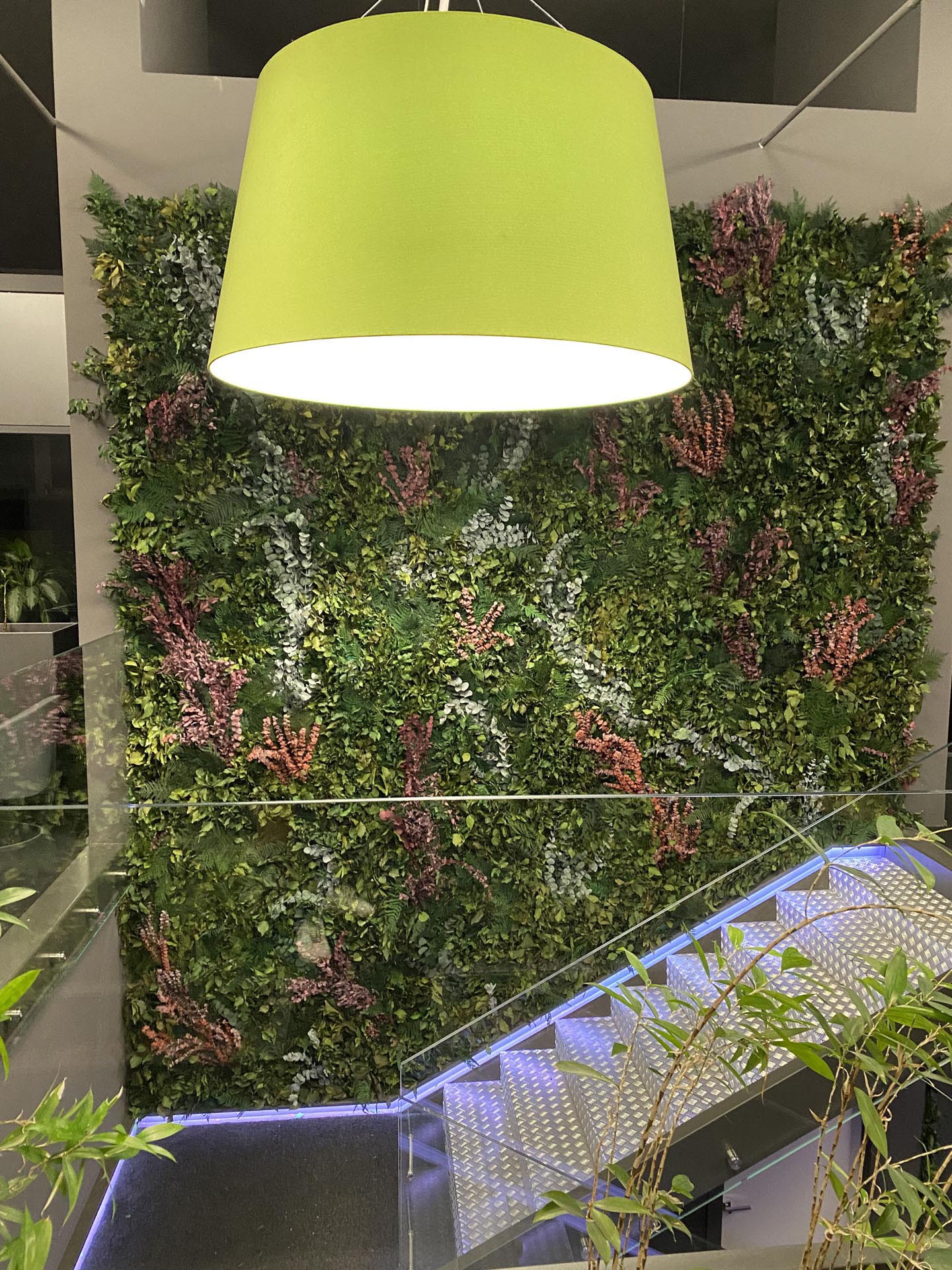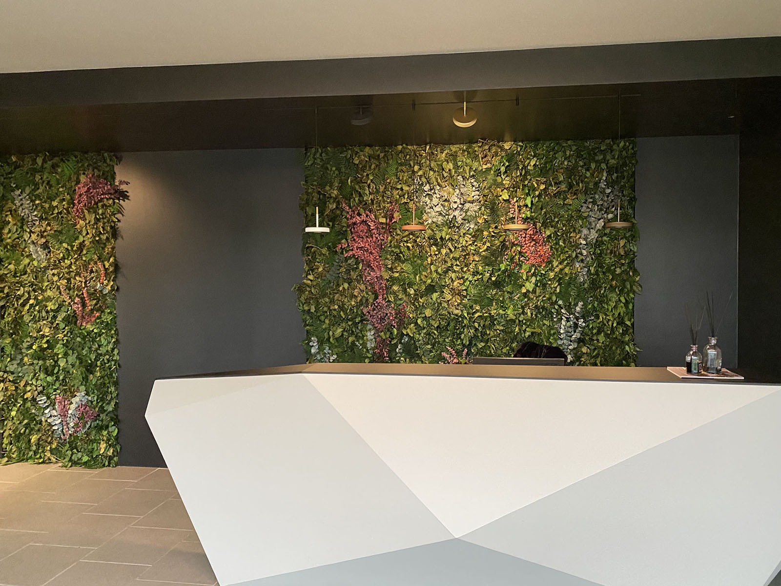 For the restyling of the reception area of OLEV Light was chosen an Urban Jungle wall Garden finish. The natural softness of the green wall creates a beautiful contrast with the solid forms of the reception counter.