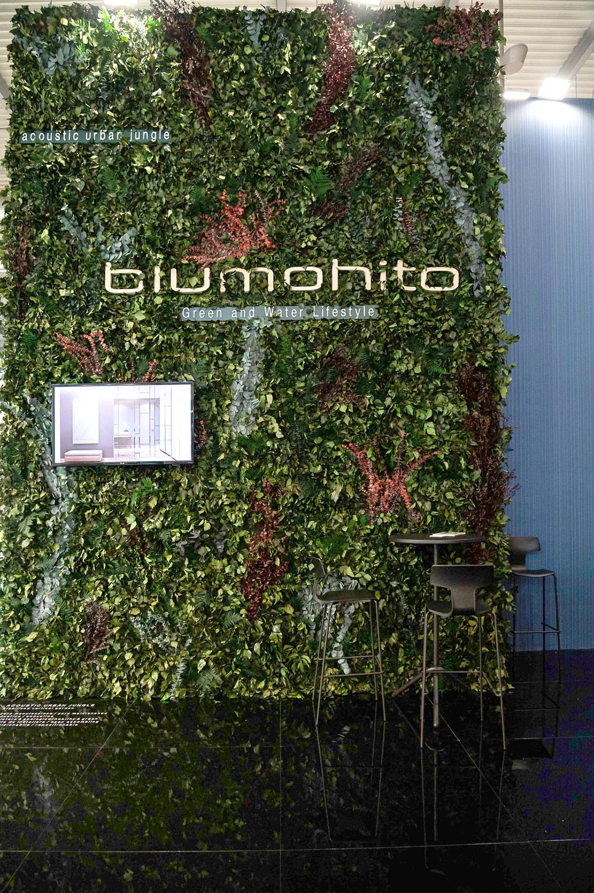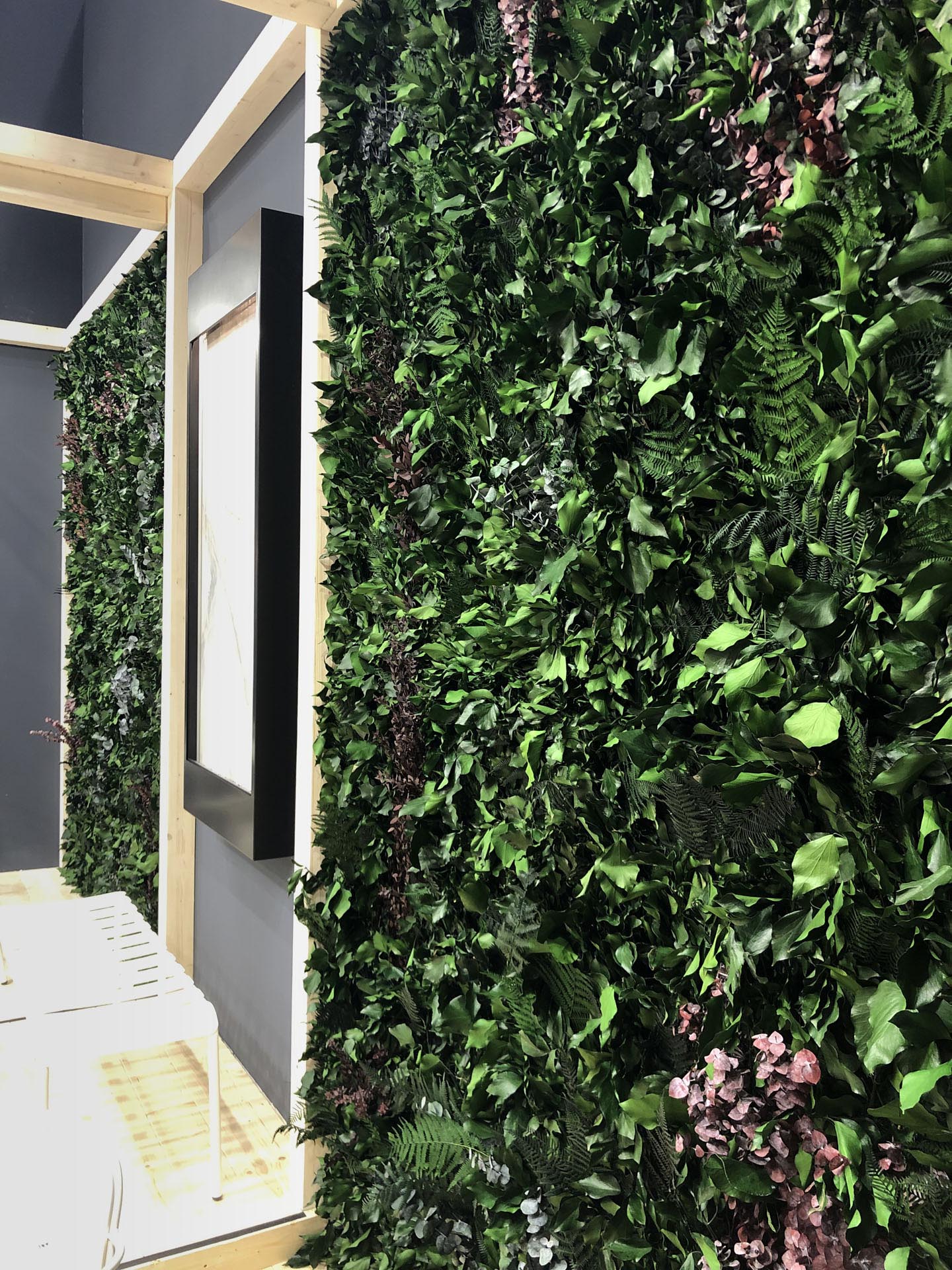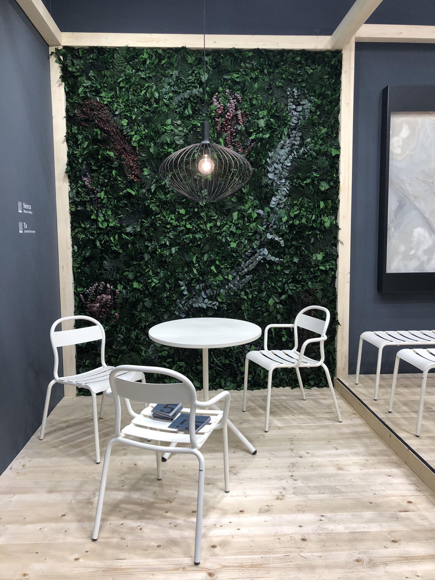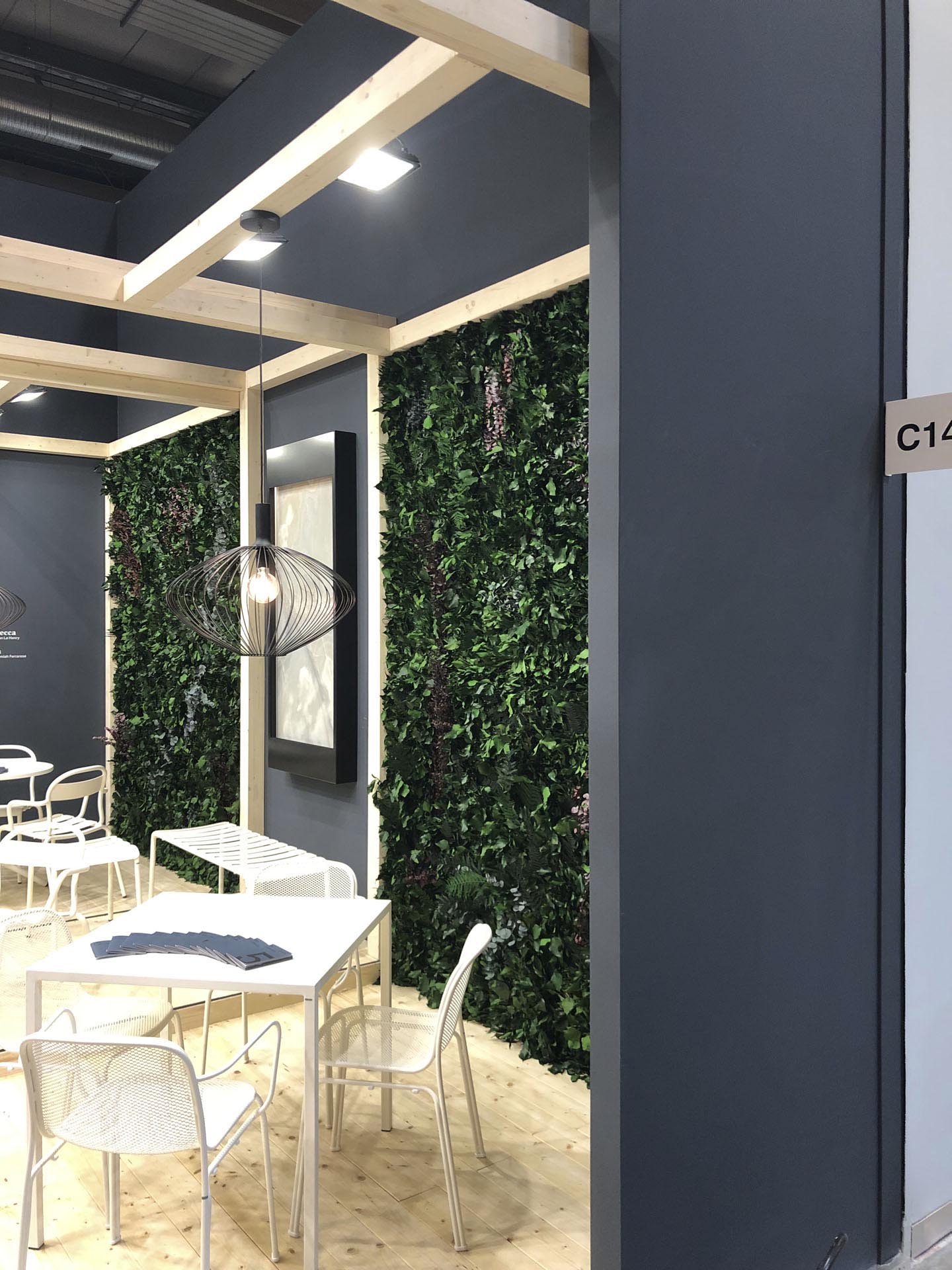 URBAN JUNGLE stabilized green wall for this warm exhibition installation by COLOS. The brand of the Cerantola group chooses nature with all its shades to set the new collection of contract seats.