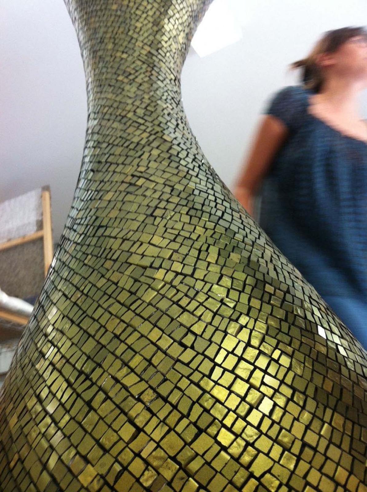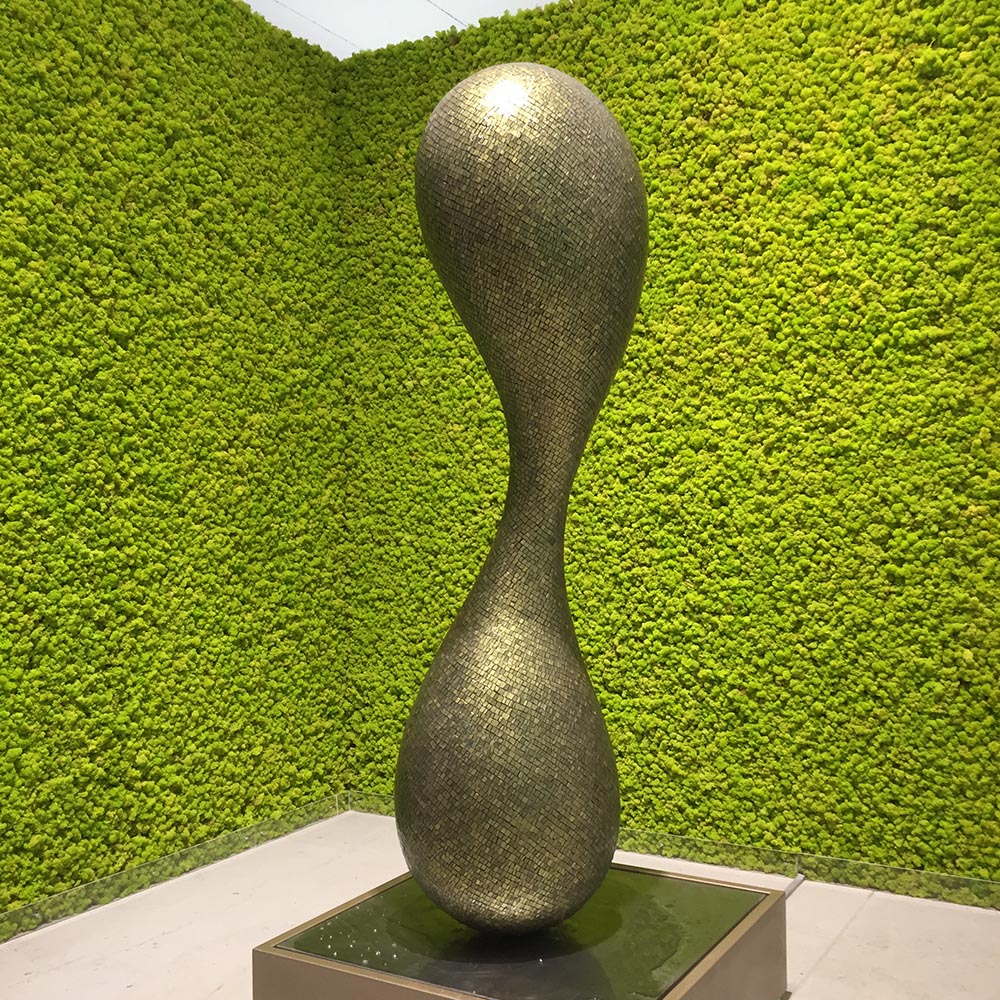 Classic Bizantine technique for this Molecola Water Sclupture UNIQUE EDITION hosted at the headquarters of Blumohito. The sinuous shape has been made of titanium mosaic pattern by the Bizantine school of Ravenna. The preciousness of the mosaic tiles and the elegance of the classic pose are enhanced by the flow of water.