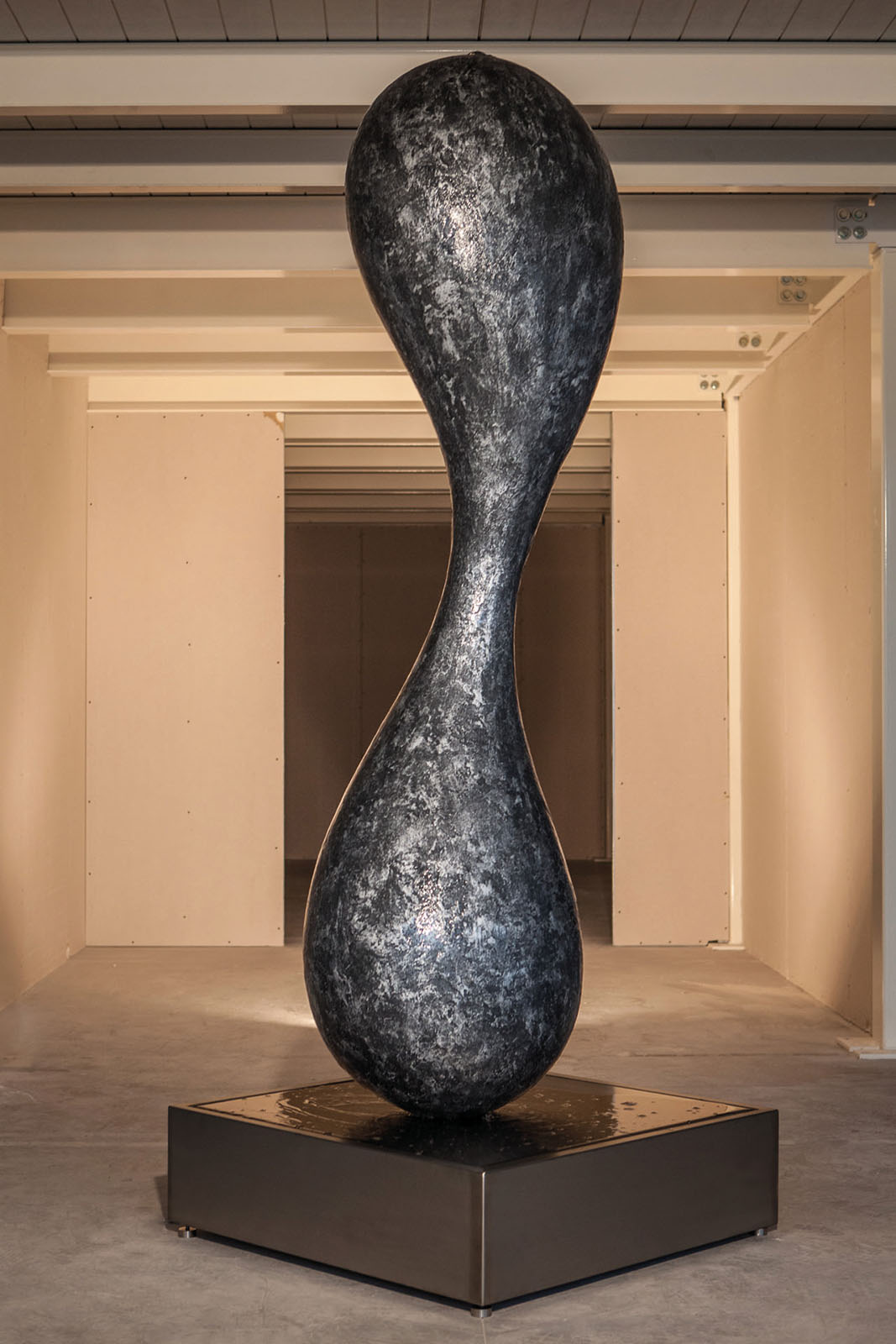 Three-dimensional solid element bathed by a veil of water. The surface is treated with hand-made artistic finish Materia. In this shot is with Materia Aluminum finish. The base on which it rests, made of stainless steel, contains inside all the automations to allow a continuous recirculation of water and make the system completely reliable in terms of safety. It works in plug & play mode thanks to the only electricity without the need for water connections. Water Sculpture contributes extremely effectively to the well-being and quality of life in interior places in which it is inserted by balancing air humidity and capturing airborne dust.