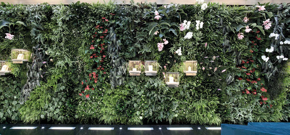 Parete di verde vivente Urban Jungle commissionata da Bulgari per lo show-room in Via Monte Napoleone a Milano. All’interno della prorompente natura sono state realizzate teche espositive con effetto “sospeso” ad esaltare diamanti, rubini e zaffiri.