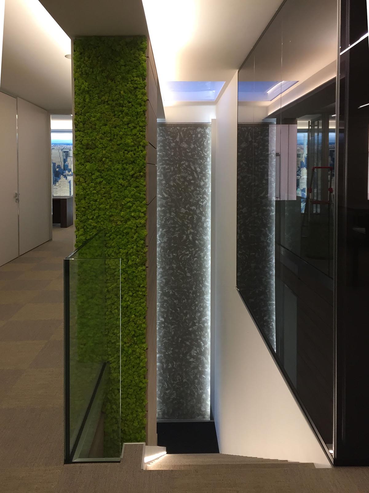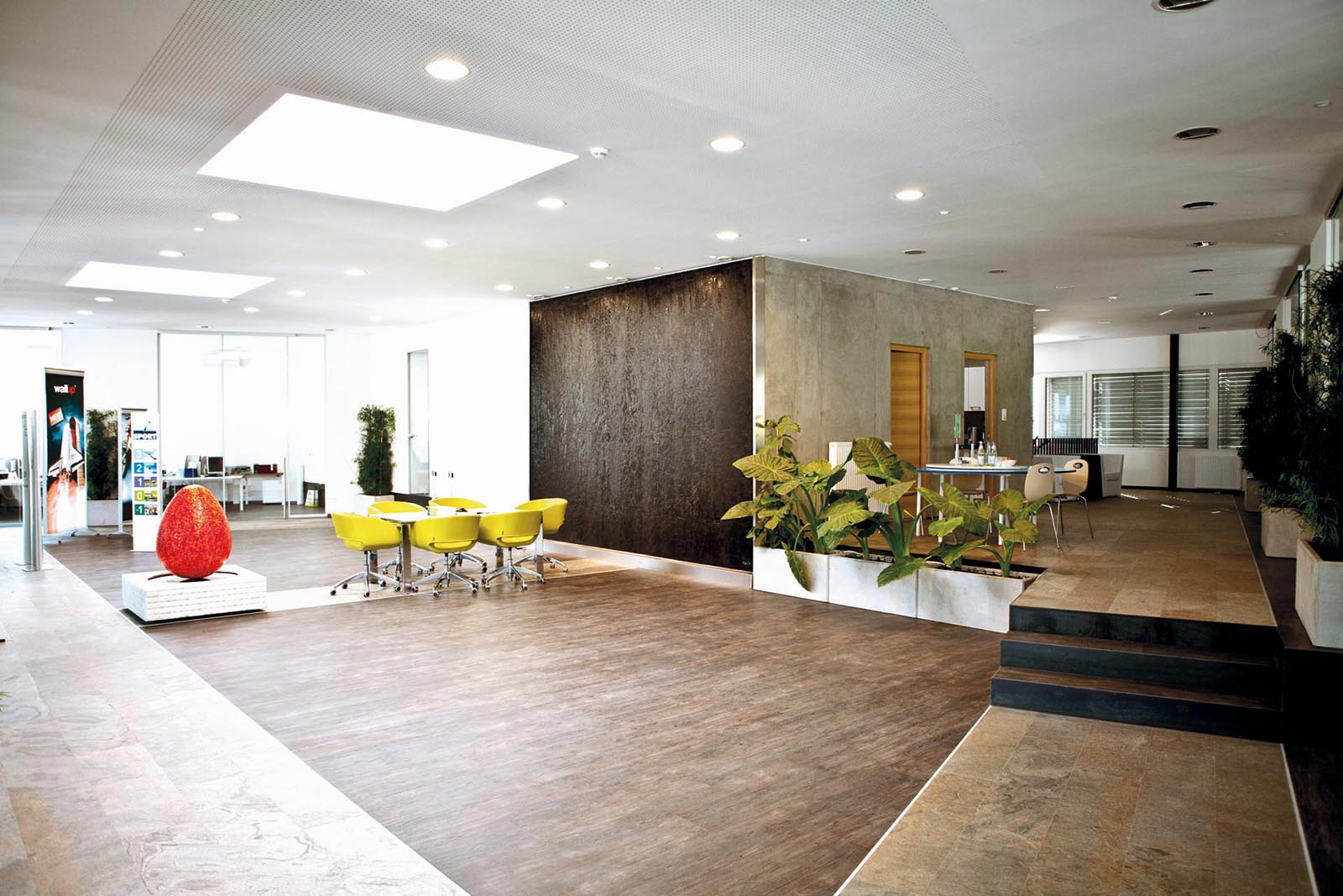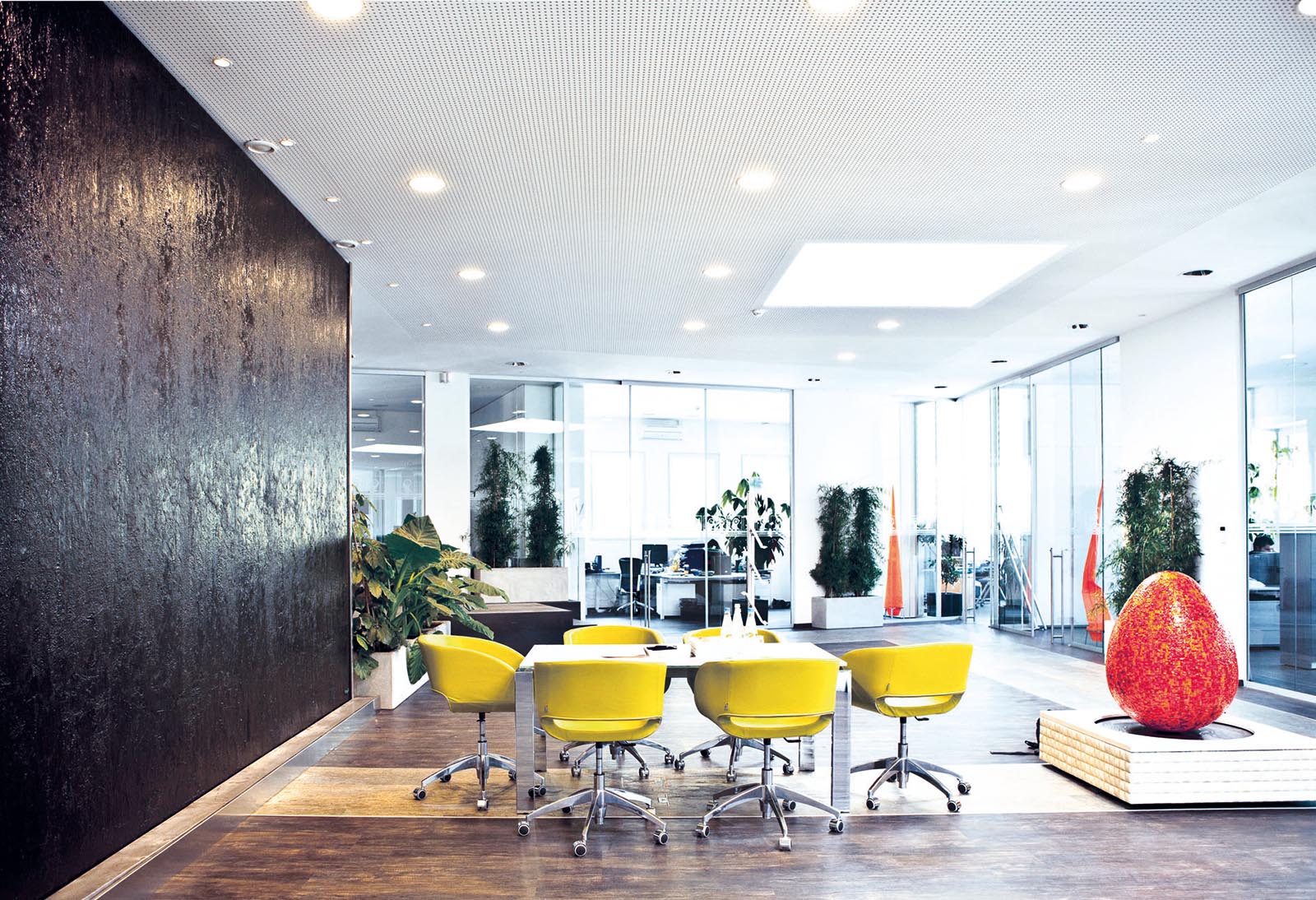 Area meeting presso Kunstdunger srl. Water Wall con superficie di scorrimento realizzata in pezzo unico “on site” con finitura custom Materia total black. L’installazione è impreziosita da una Unique Edition Water sculpture egg con finitura in mosaico artistico Orsoni.