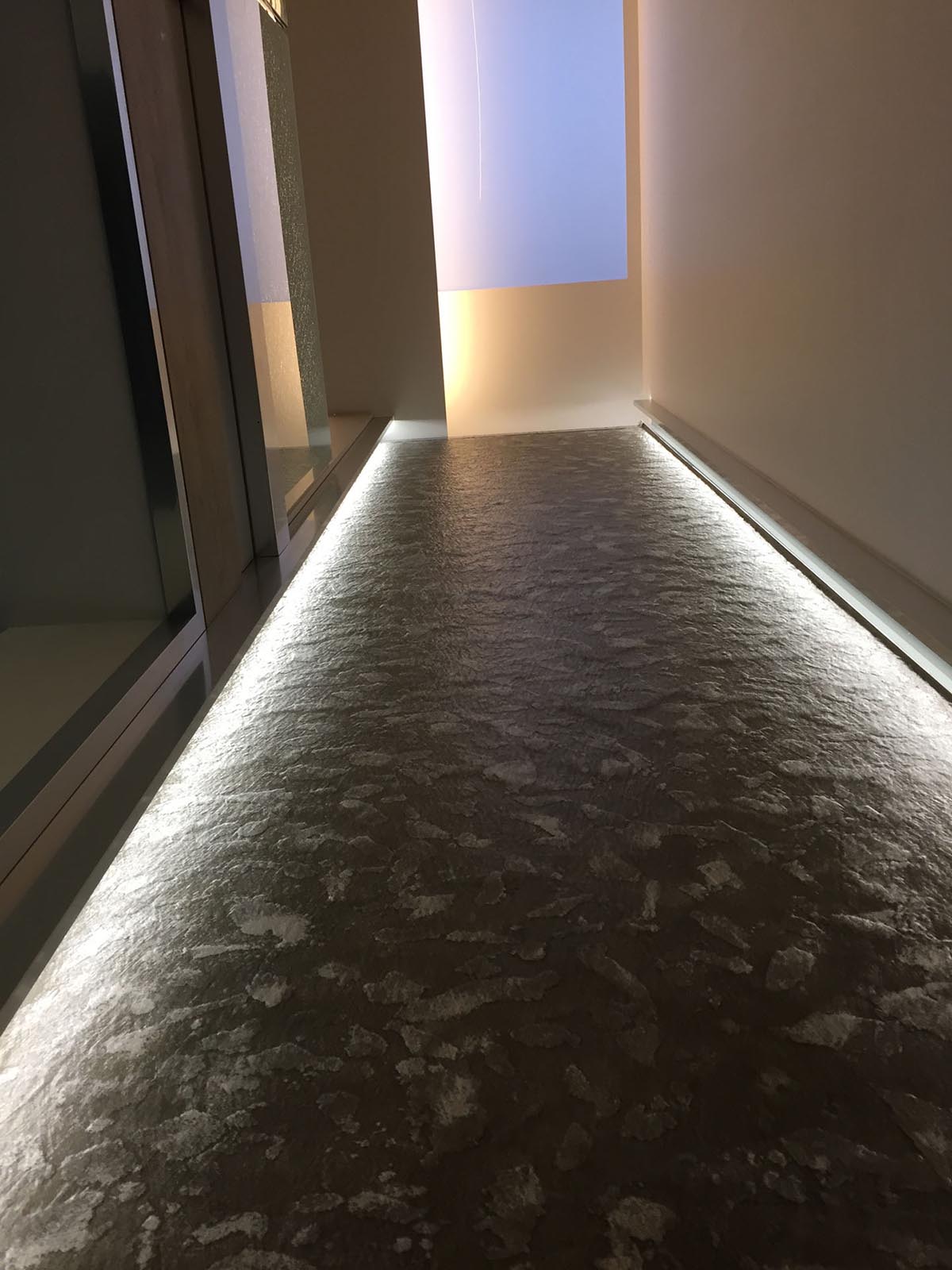 CUSTOM WATER WALL finitura Materia Ottanio realizzata in pezzo unico “on-site” presso la sede BLUMOHITO. In questo progetto sono state realizzata una contro parete in cartongesso creando un effetto di complanarità con la superficie di scorrimento acqua.