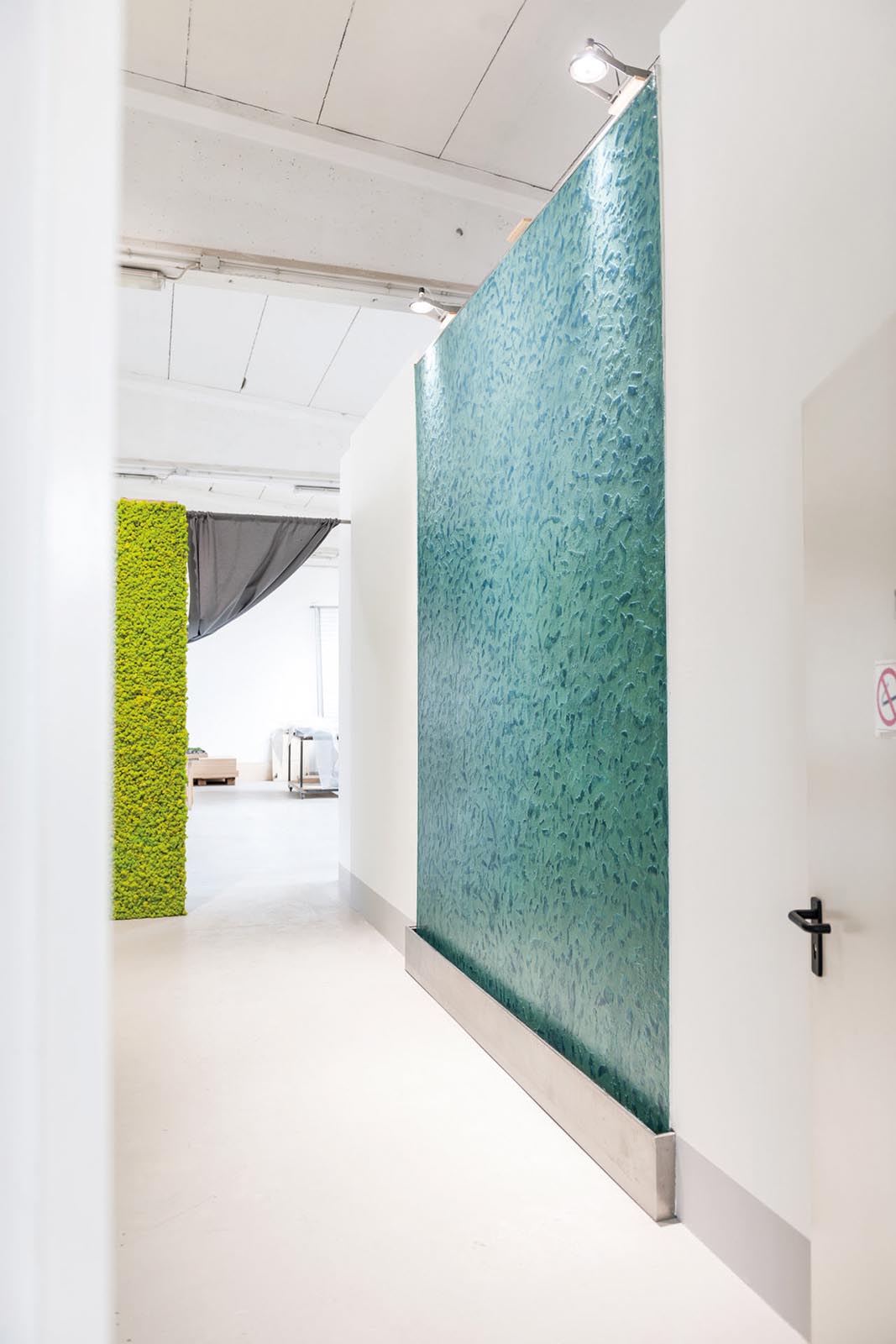 Parete Water Wall con finitura custom Materia nell’area entrance del nuovo show-room di Alpar System a Leno. Realizzazione in opera in pezzo unico, totalmente automatizzata. La natura è protagonista di questo bel progetto che abbina il naturale scorrere dell’acqua a pareti realizzate in Smart Acoustic Green.
