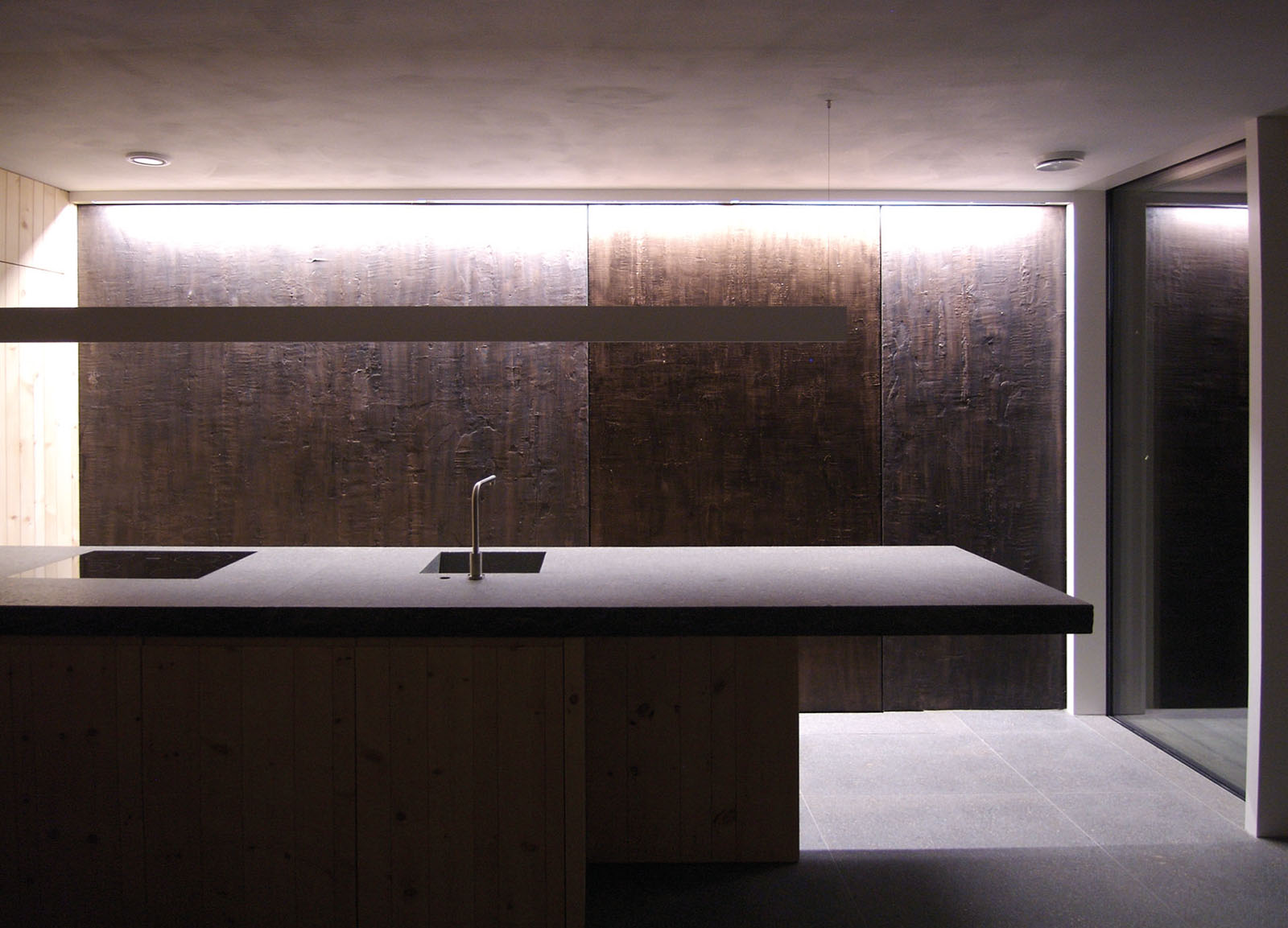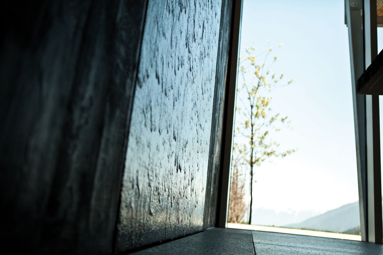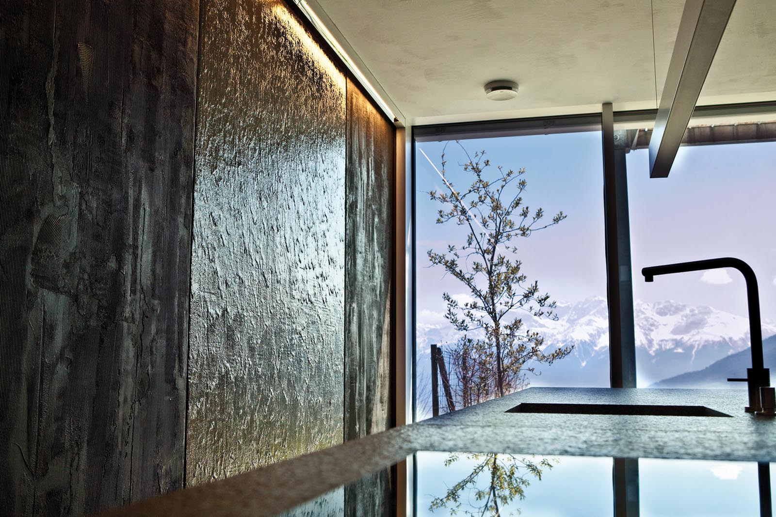 Progetto sviluppato in collaborazione con STUDIO MONGIELLO di Salò per la realizzazione di questa importante parete lunga 7.20 metri per più di 3.30 di altezza. Questa CUSTOM WATER WALL è stata realizzata in 4 moduli Materia presso la nostra sede e solamente assemblata in opera per ottimizzare i tempi e costi di logistica. Come da richiesta dei progettisti la finitura Materia è stata campionata e realizzata per replicare colori e texture delle piastrelle in gres grigio scure del pavimento.