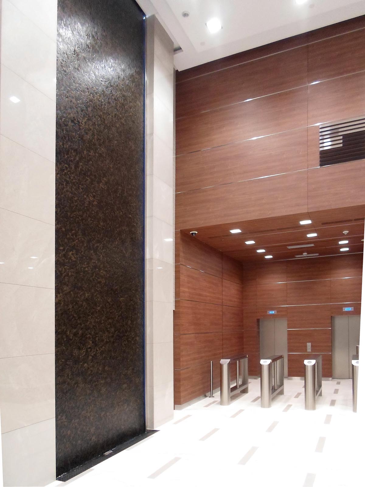 Centro Direzionale. Intervento in area reception con parete a velo d’acqua dotata di superficie di scorrimento realizzata in opera in pezzo unico ”on site” con finitura custom Materia. L’imponente Water Wall alta 8 metri per 2,5 di larghezza è totalmente automatizzata e gestita da impianto tecnico dedicato.